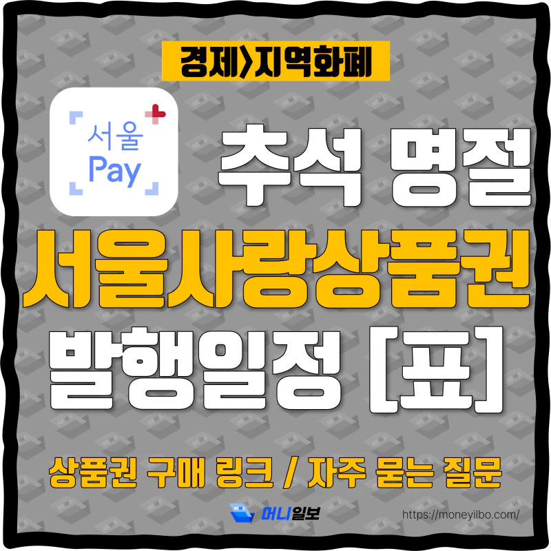 추석 명절을 대비하여 서울시와 자치구가 서울사랑상품권을 발행합니다. 서울사랑상품권은 액면가의 7% 할인된 금액으로 구매할 수 있기 때문에 구매하는 것 만으로도 7% 이득입니다. 시와 자치구의 공동 예산으로 발행하는 서울사랑삼품권(시·자치구)와 자치구 단독 예산으로 발행하는 서울사랑상품권(자치구)이 있습니다.